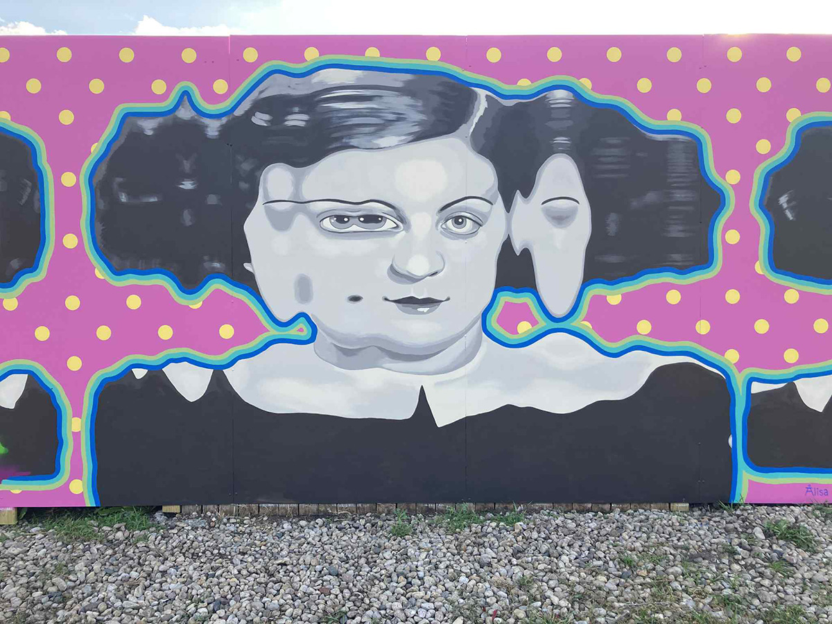 Y&O: Travelers in Time and Space '23 mural 16.5 x 9.6' Located in Centre of Elgin, IL public garage, at 95 Symphony Way. Thanks to Elgin Cultural Arts Commission for this wonderful opportunity!